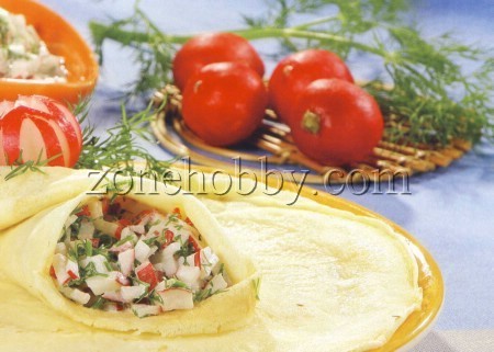 Выложите начинку из редиса на блин и сложите по предложенным выше вариантам.