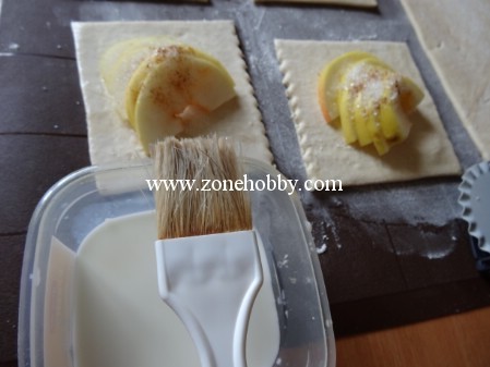Яблоки посыпаем сахарным песком и корицей. Формируем из теста конверт. Чтобы края теста лучше скреплялись, рекомендуется их чем-то промазать — молоком, водой или взбитым яйцом.